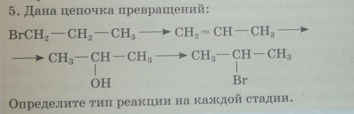 BrCH2-CH2-CH3 --(KOH, спирт, t)--> CH2=CH-CH3