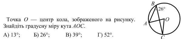 Угол авс вписанный следовательно дуга ас равна 52°. (свойство вписанного угла) аос центральный следовательно равен дуге ас и равен 52° (т.к. дуга ас меньше полуокружности)