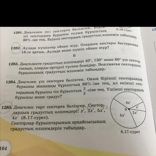 1285 задание пожалуйста помогите!!.Дөңгелек үш секторға бөлінген.Оның бірінші секторының бұрышы жазыңқы бұрыштың 80%-іне тең, ал екінші секторының бұрышы тік бұрытың