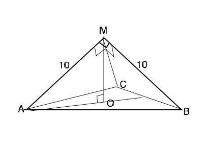 Объяснение: Формула объёма пирамиды V=S•h/3. Назовём пирамиду МАВС. Все боковые ребра правильной пирамиды равны. МА=МВ=МС=10 см Т.к. углы боковых граней при вершине М=90°, углы при основаниях боковых граней равны по 45°, а их основания равны 10:sin45°=10√2. Вершина правильной пирамиды проецируется в центр описанной около основания окружности. Её радиус ОА=АВ/√3=10√2:√3. Высота пирамиды перпендикулярна основанию, ∆ АМО прямоугольный. По т.Пифагора высота МО=√(AM*-AO*)=√[10*-(10√2:√3)*]=10/√3