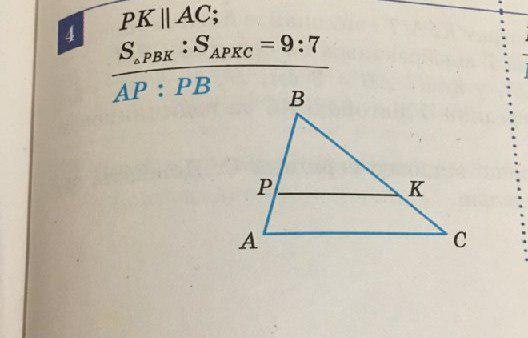т.к. треугольники PBK и ABC подобны, сторона AP подобна стороне PB, с отношением 9-7:7 = 2:7