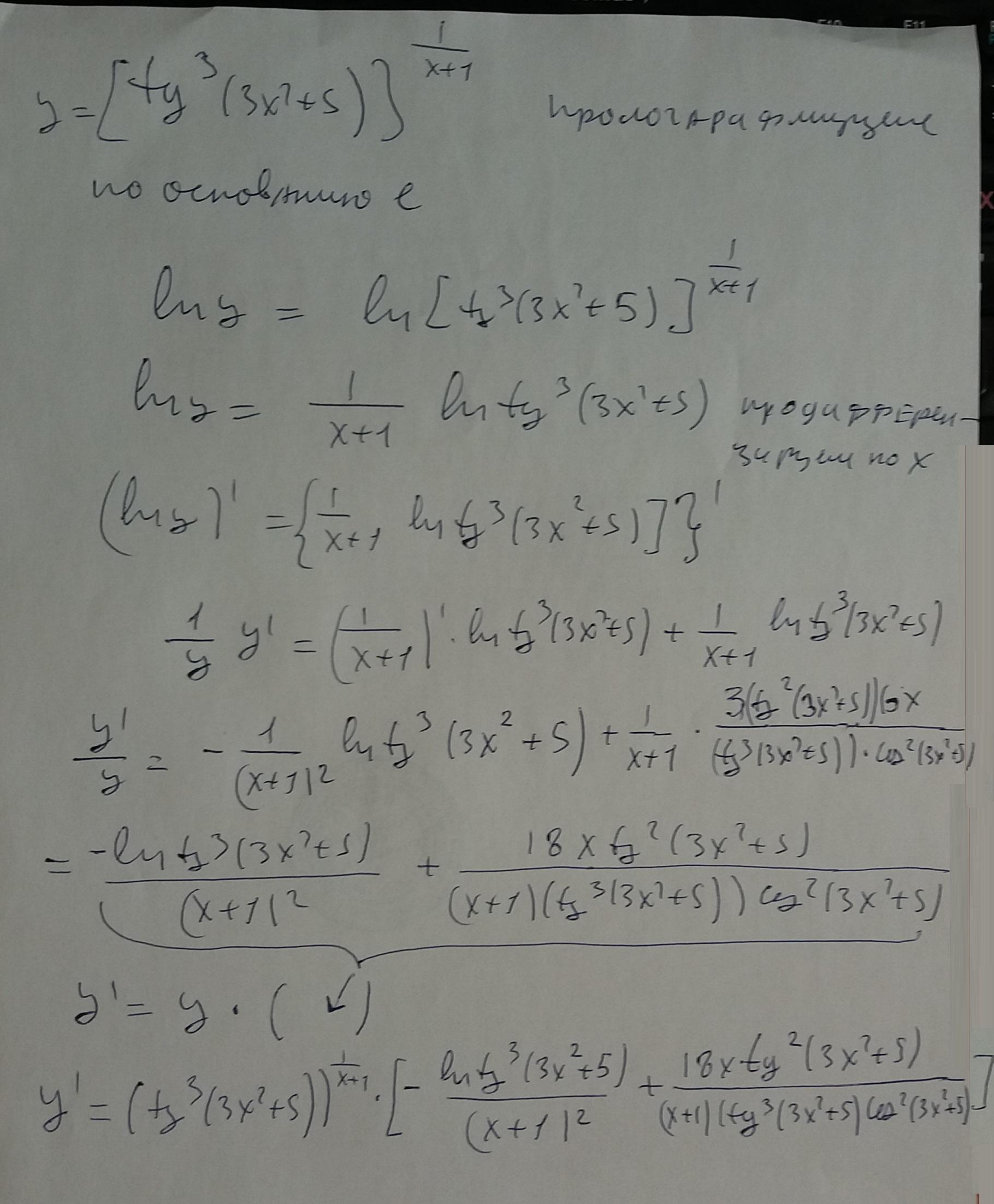 (tg^3 (3x^2+5))^(1/(x+1)).