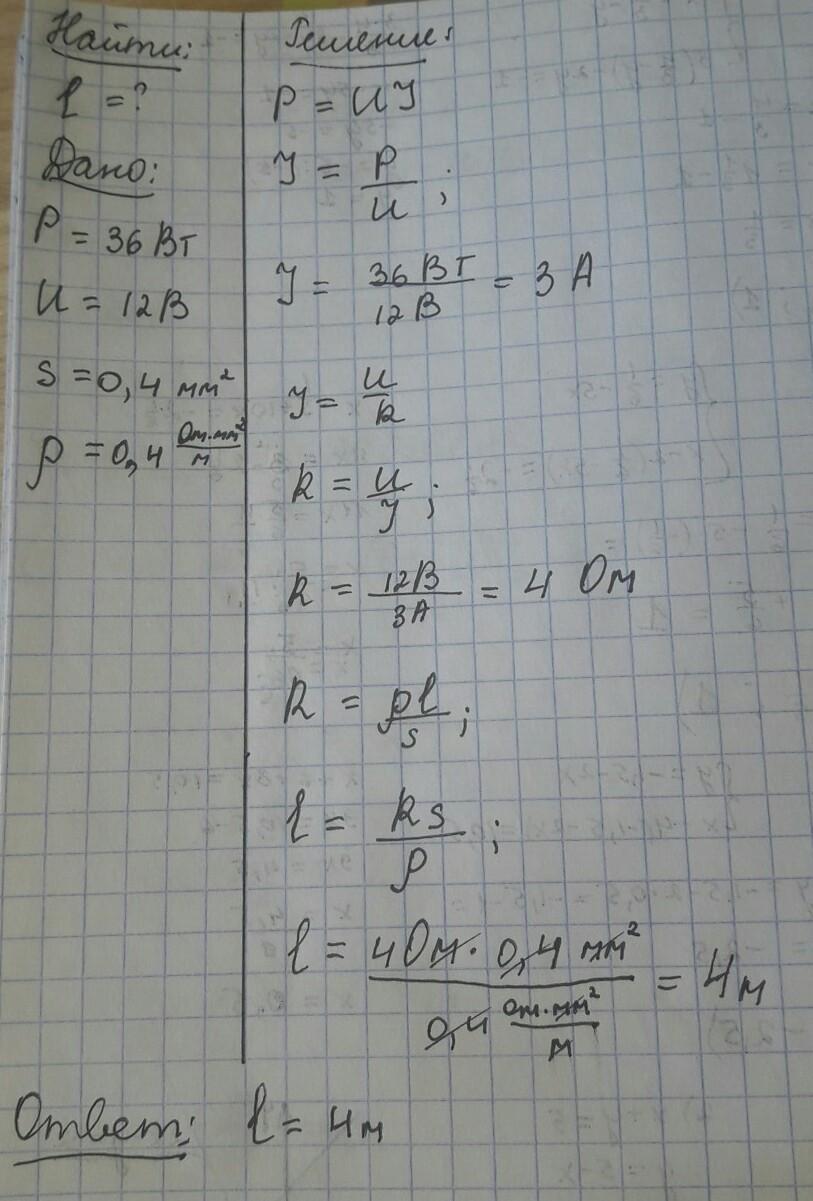 Мощность, потребляемая реостатом равна 36Вт, напряжение на его зажимах равна 12В. Определить длину никелинового провода, прошедшего на изготовление реостата, если площадь его поперечнего сечения равна 0, 4мм^2?