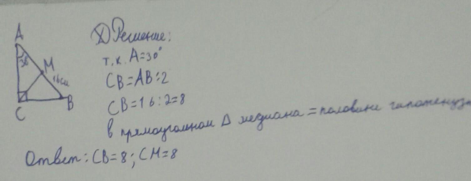 Треугольник ABC-прямоугольный, угол C=90 градусов, CM-медиана, AB=16 см, угол A=30 градусов. Найти BC и CM