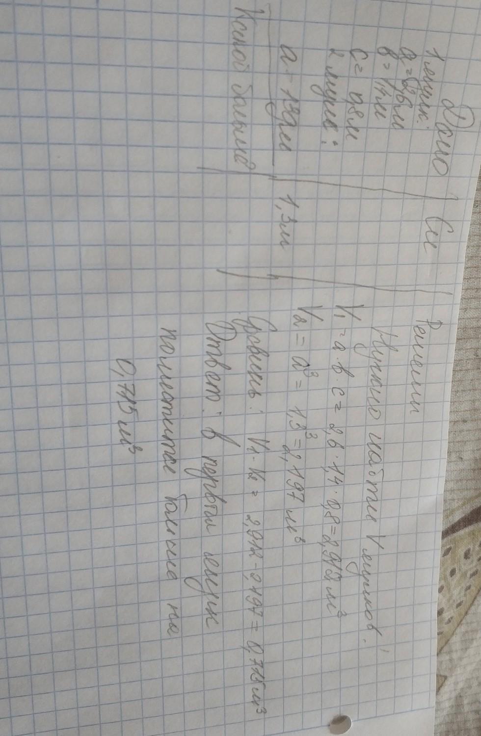 Изготовили два ящика для хранения промышленных отходов.Один ящик в форме прямоугольного параллелепипеда с измерениями 2,6м,1,4м и 0,8м,а другой- в форме куба с ребром 13 дм.В какой из ящиков поместится больше отходов и на сколько?