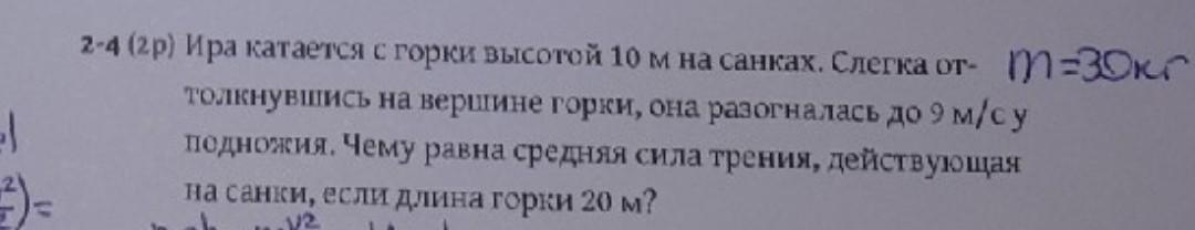 Ира катается с горки высотой 10м на санках. Слегка оттолкнувшись на вершине горки, она разогналась до 9м/с у подножия. Чему равна средняя сила трения, действующая на санки, если длина горки 20м?