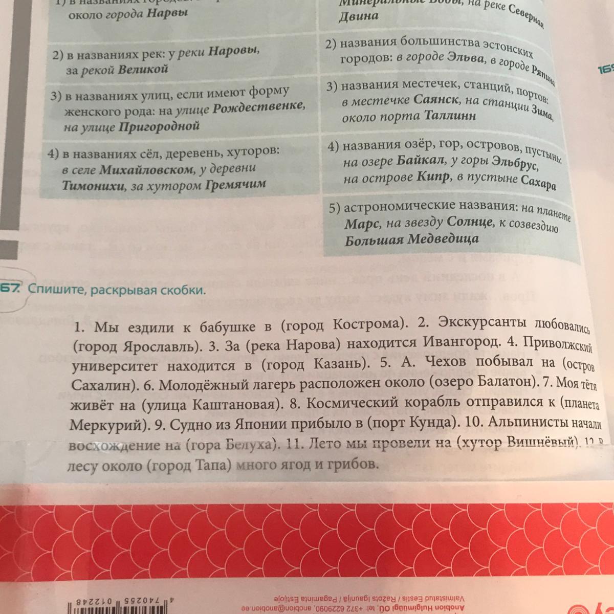 Мы ездили к бабушке в город Кострома. Экскурсанты любовались городом Ярославль. За рекой Нарова находится Ивангород. Приволжский университет находится в городе Казань. Чехов побывал на острове Сахалин. Молодежный лагерь расположен около озера Балатон. Моя тётя живёт на улице Каштановая. Космический корабль отправился к планете Меркурий. Судно из Японии прибыло в порт Кунда. Альпинисты начали восхождение на гору Белуха. Лето мы провели на хуторе Вишнёвый. В лесу около города Тапа много ягод и грибов.