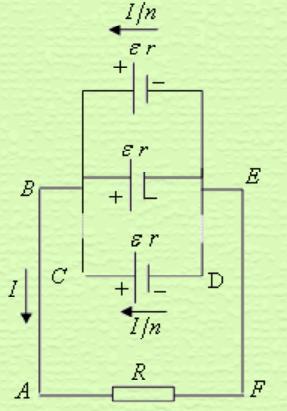 При параллельном соединении n одинаковых элементов в батарею ЭДС не меняется, а внутреннее сопротивление уменьшается в n раз.
