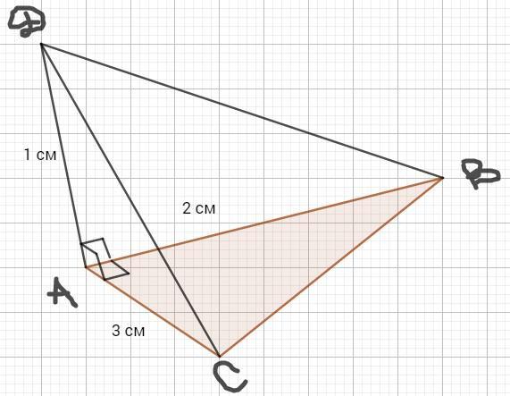 К плоскости прямоугольного треугольника ABC, m (A) = 90 проведён перпендикуляр AD=1 см. Найти площадь треугольника DBC, зная, что кареты AC = 3 см, АВ = 2 см.