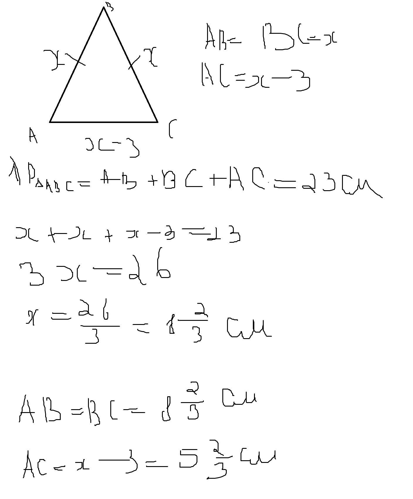 Знайдіть сторони рівнобедреного трикутника якщо його периметр дорівнює 23 см. а основа менша на 3 см від бічної сторони