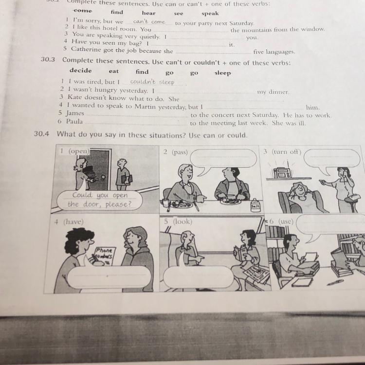30.3 2.couldn’t eat 3. Can’t decide 4.couldn’t find 5.can’t go 6.couldn’t go