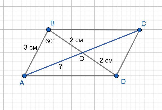 AO² = 3² + 2² - 2*3*2*cos60° = 9 + 4 - 12* 1/2 = 13 - 6 = 7;