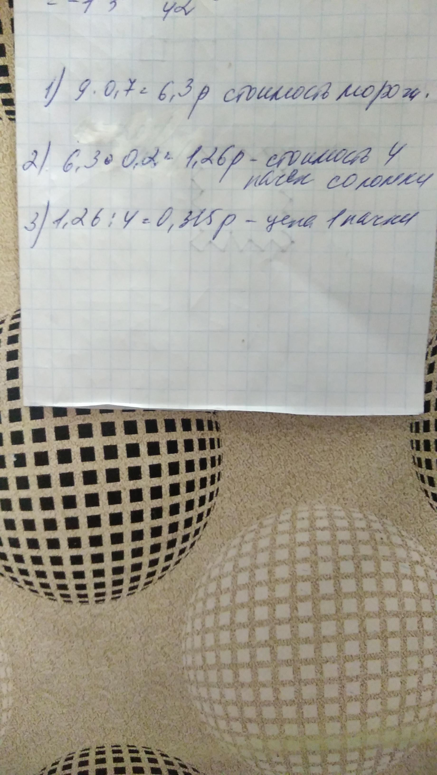 4 пачки соломки -это 20% от 9 пачек мороженого,сколько стоит одна пачка соломки,если 1 пачка мороженого стоит 0.7 рублей