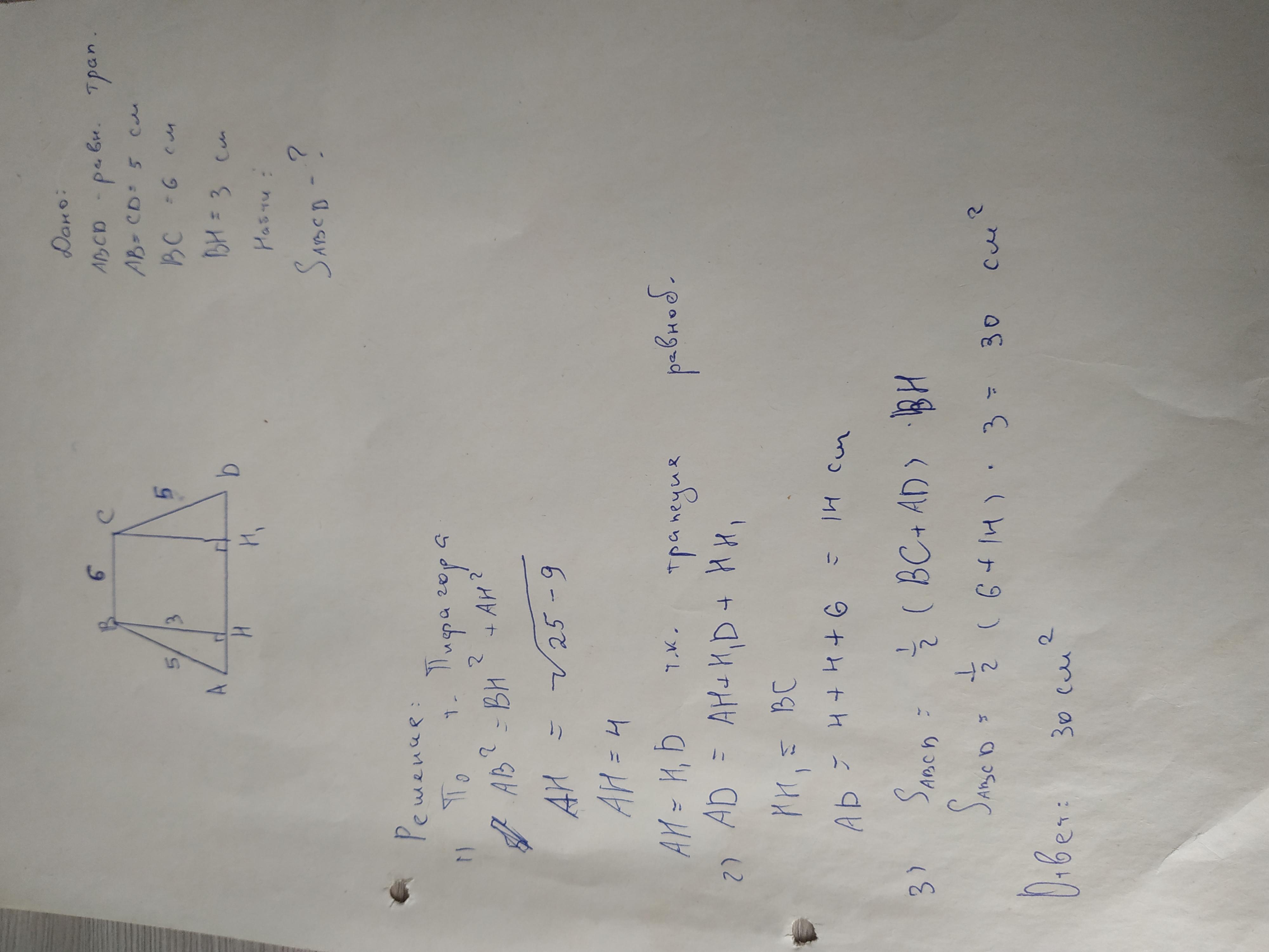 дана равнобокая трапеция меньшее основание равно 6см боковая сторона-5см высота 3 см найти площадь трапеции с рисунком с полным решением и написать дано этого рисунка пожалуйста