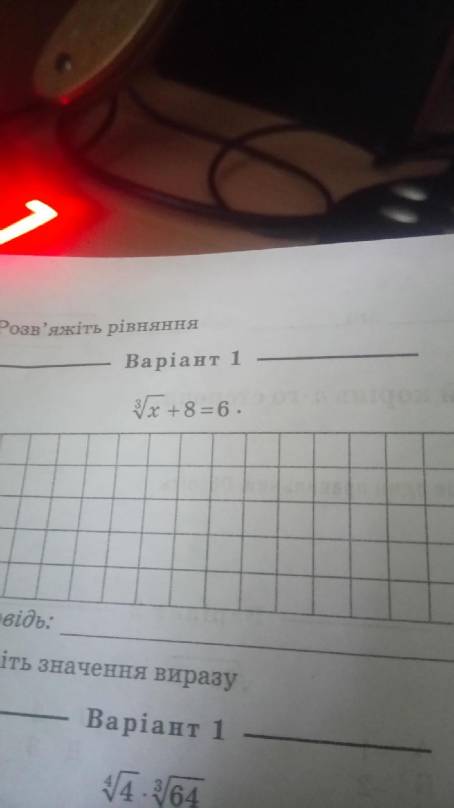 3. ³√x + 8 = 6; ³√x = 6 - 8; ³√x = - 2; x = (-2)³; x = -8/ Відповідь: -8.