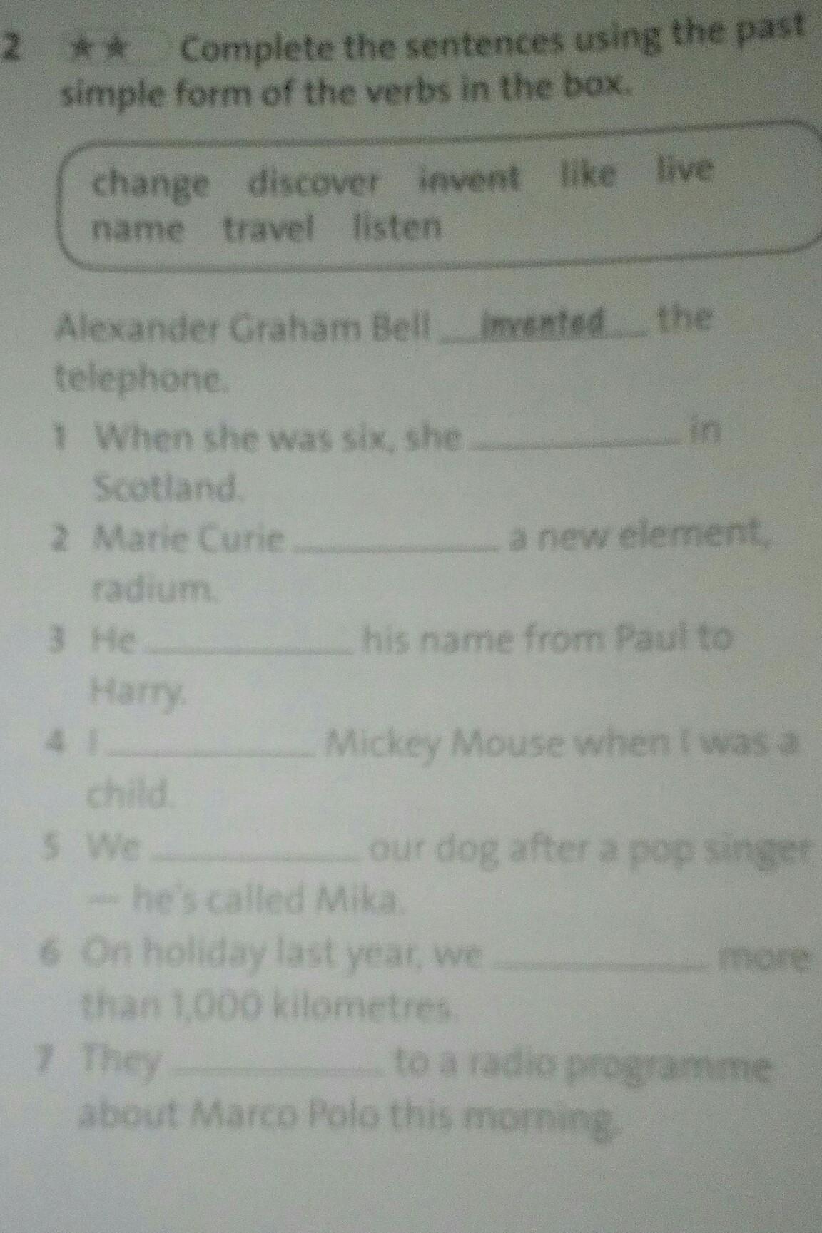 1 live , 2 discover, 3 change 4 like , 5 listen , 6 travel , 7 name.