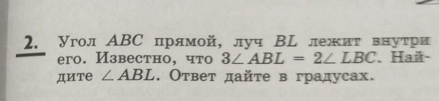 Ответ:пусть угол абл - х. Тогда 3х = 2 лбс. Они будут в отношении одинаковы, следовательно 3х+ 2х = 90°. Х = 18° ответ :18°
