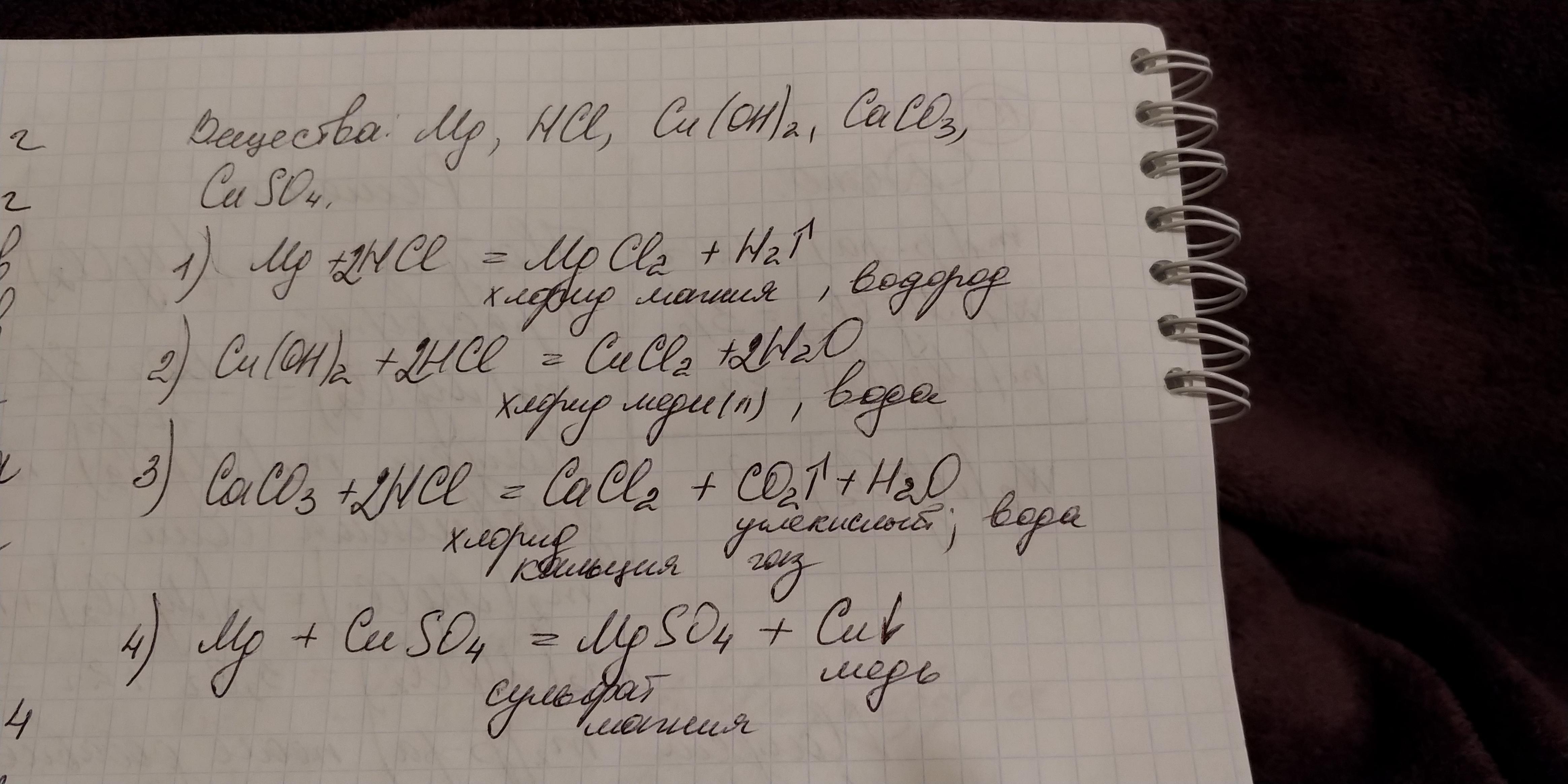 Химические реакции можно провести между веществами: магний, соляная кислота, меди