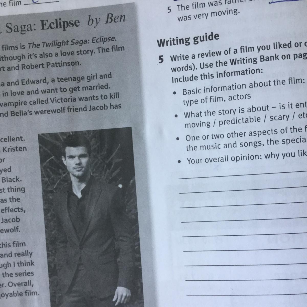 Помогите пожалуйста с сочинением по английскому. 7 класс. Надо написать сочинение (описание фильма). Типо в начале какие фильмы тебе нравятся, и какой особенно понравился. Описать что это (фантастика, ужасы, боевики или другие). Написать главных актеров (сам напишу), сюжет и так далее. Помогите пожалуйста. 5 задание