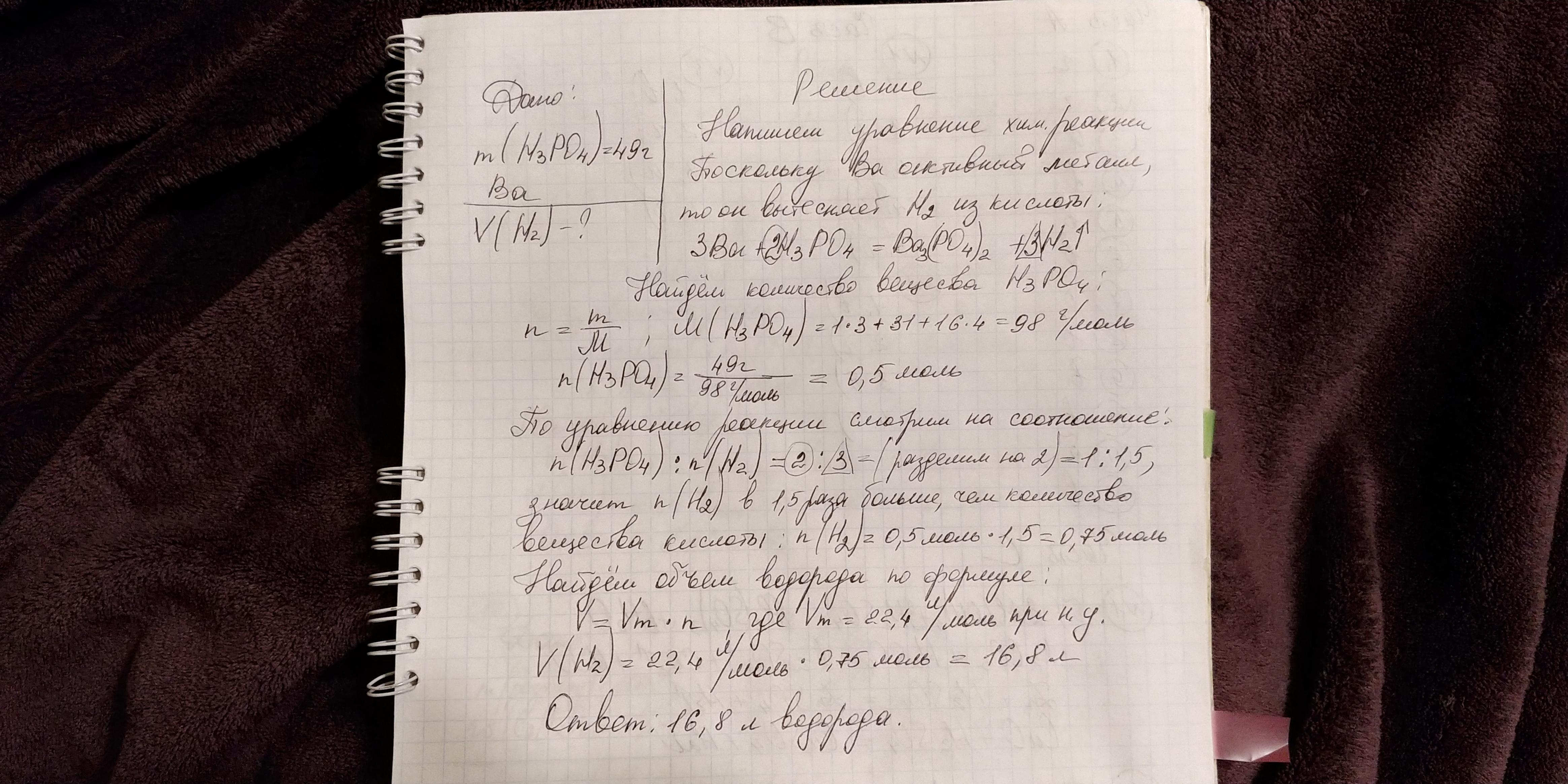 вычислите объем газа который образуется при взаимодействии бария с фосфорной кислотой массой 49г.