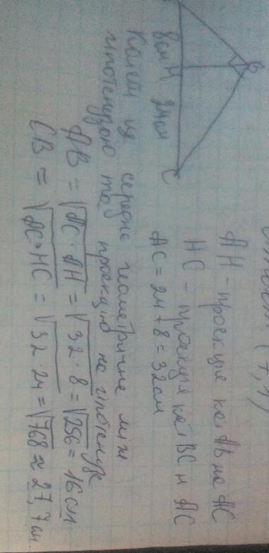 висота прямокутного трикутника ,проведена до гіпотенузи ,ділить її на відрізки завдовжки 8см і 24см.знайдіть катети трикутника
