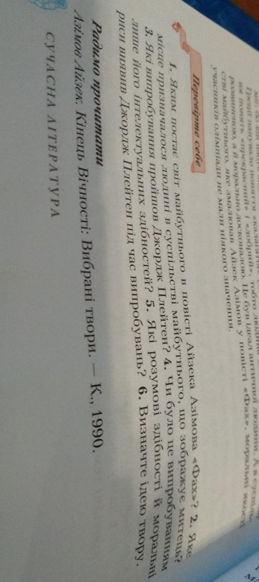 3. Він не здав тест, і його виявили як непридатного до здобування знань та до непридатного до праці. Його відправили в спеціальний «інтернат для недоумкуватих», але він все таки намагався читати та здобувати знання. 4. Так, тому що він не використовував лише знанння, які йому вставили, а він також збирав знання с книг «по крихтам» 5. Сила духу, не зупинятися перед своєю метою. 6. Навіть якщо тебе недооцінили, ти можеш доказати, що ти не такий.