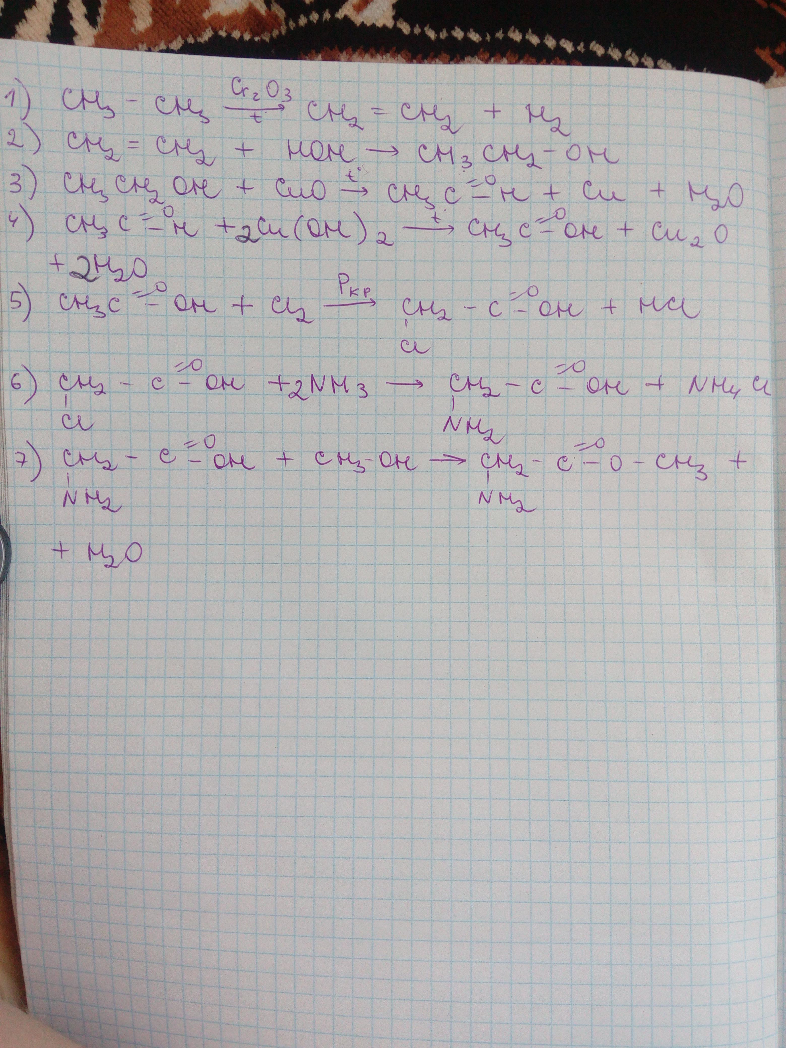 C2H6- C2H4- C2H5OH- CH3COH - CH3COOH- CH2ClCOOH- CH2NH2COOH - CH2NH2COOCH3