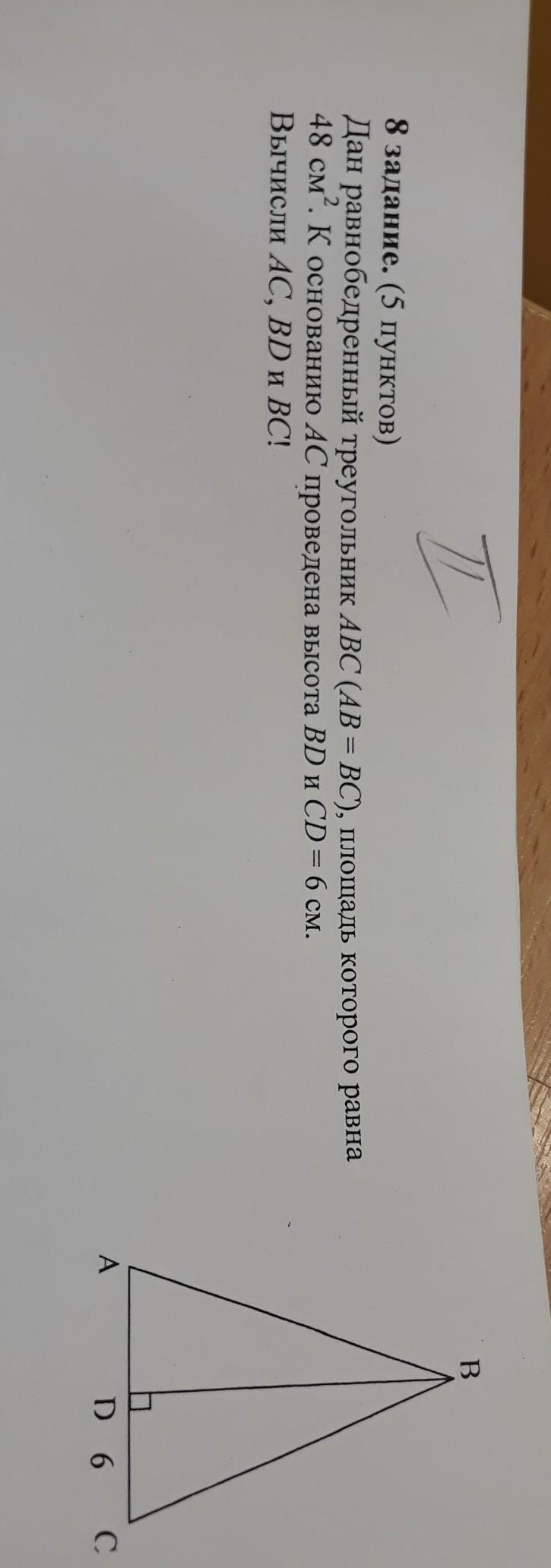 Дано:ΔАВС где АВ=ВС,S=48см²,h=BD,CD=6см