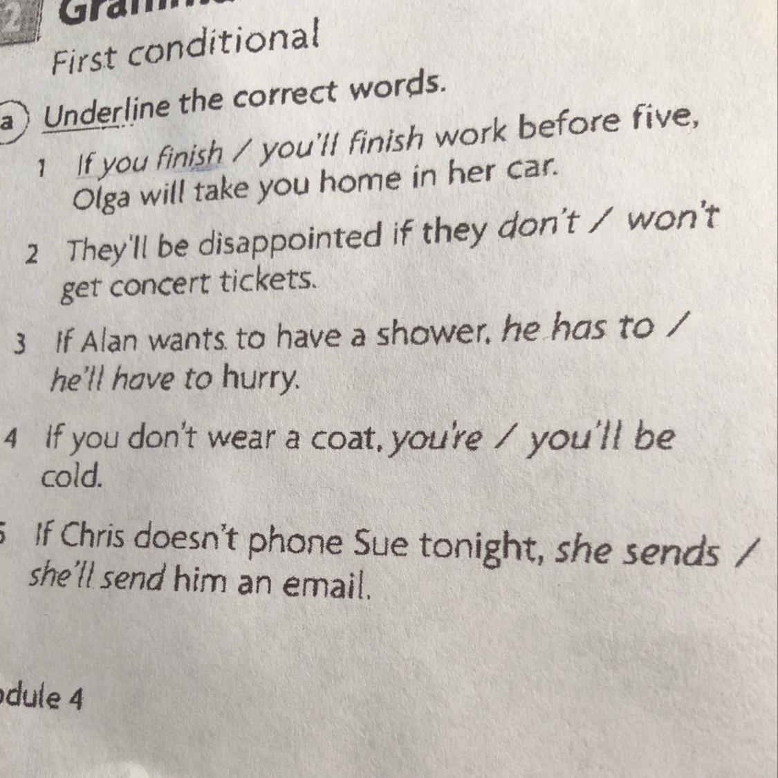 1 finish 2 don’t get 3 he’ll have to hurry 4 you’ll be cold 5 she’ll send