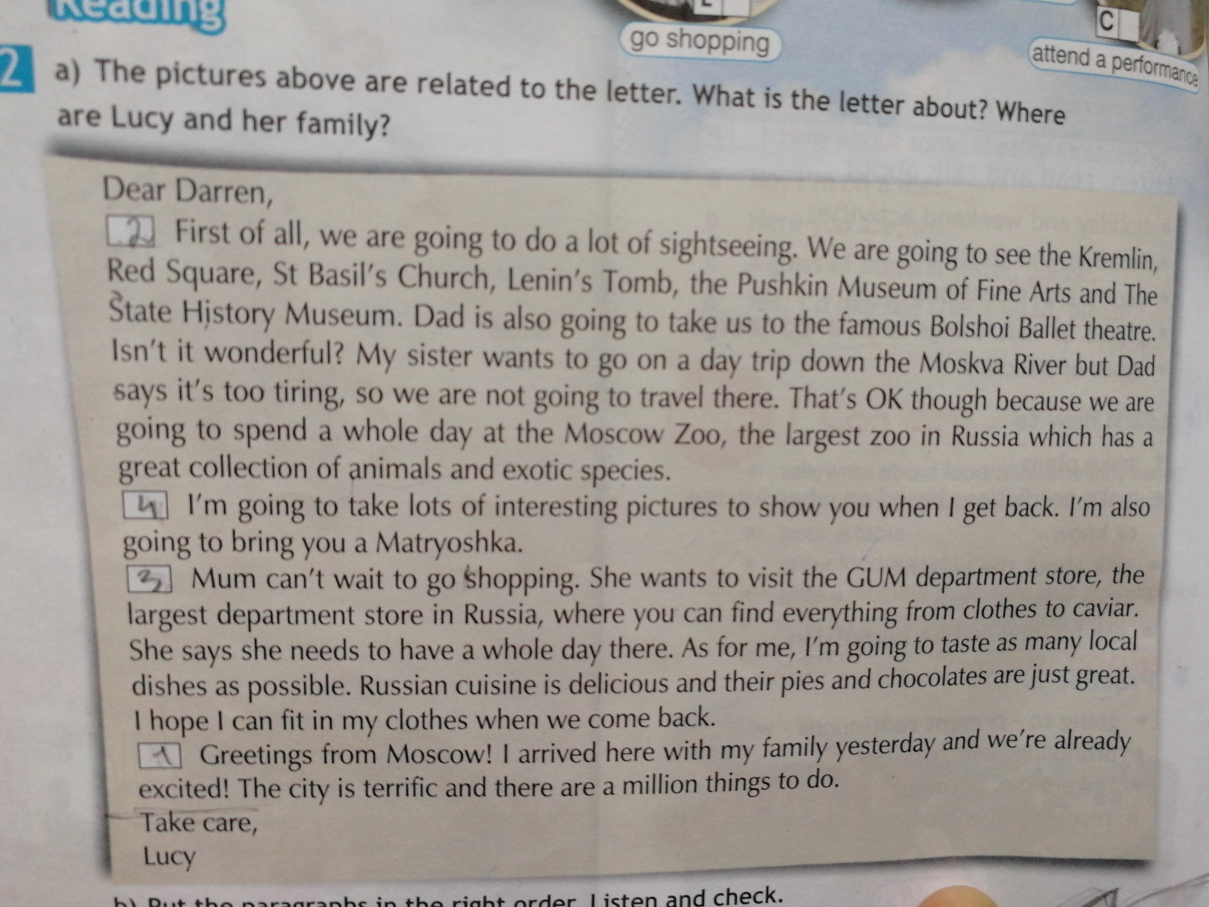 First of all, we did a lot of sightseeing. We saw the Kremlin..... Dad also took us to the famous Bolshoi Ballet theatre. Didn't it wonderful? My sister wanted to go on a day trip down the Moskva River but Dad said it's too tiring, so we didn't to travel there.