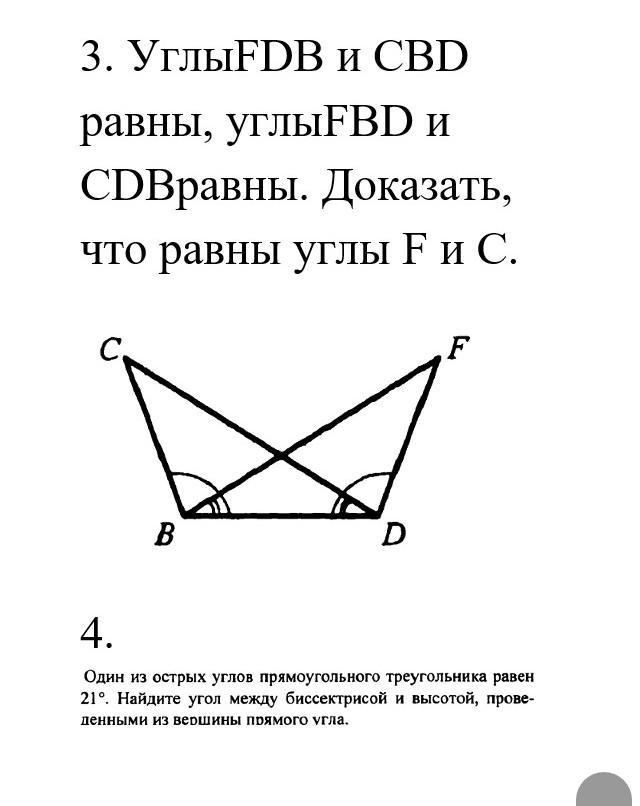 Рассматриваем треугольники CBDиBDF, сумма углов треугольник равна 180 °. Отсюда равенство углов