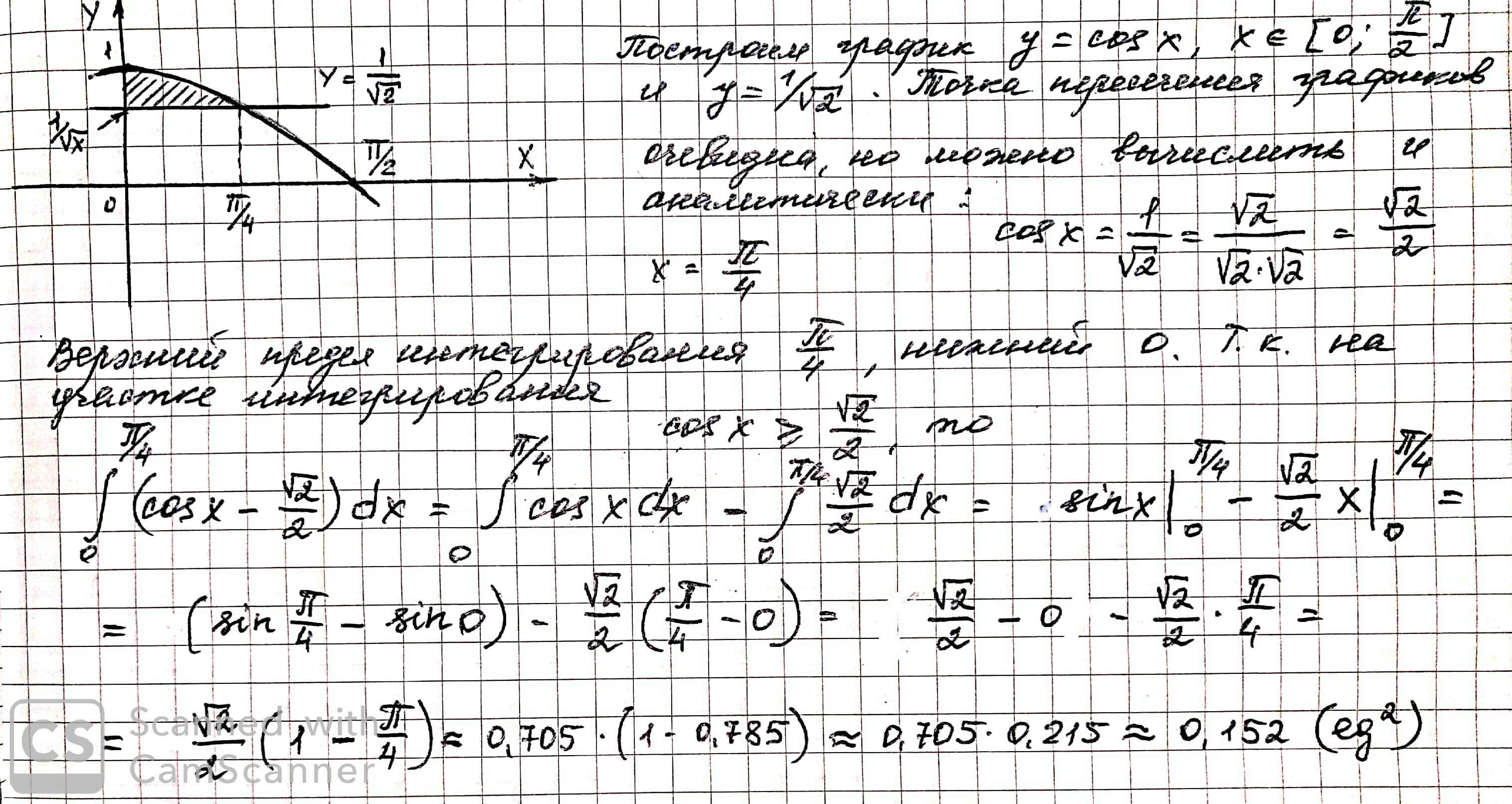 Помогите пожалуйста. Геометрические приложение определенного интеграла. Вычислить площадь фигуры, ограниченной графиком функции y=cos(x), где x принадлежит [0, pi/2 ] и прямой y=1/sqrt{2} (1/корень из 2)