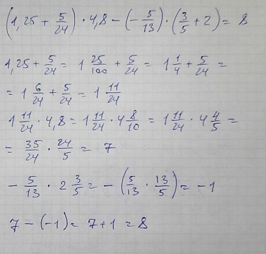 Пошаговое объяснение: (1.25+ 5/24)*4.8-(-5/13)*(3/5+2)