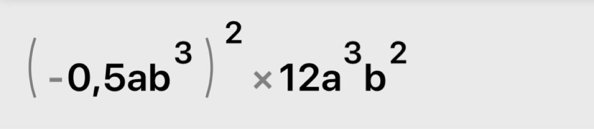 (-0,5ab^3)^2*12a^3b^2=0,25a^2b^6*12a^3b^2=3a^5b^8. Ответ: 3a^5b^8. ^-это степень.