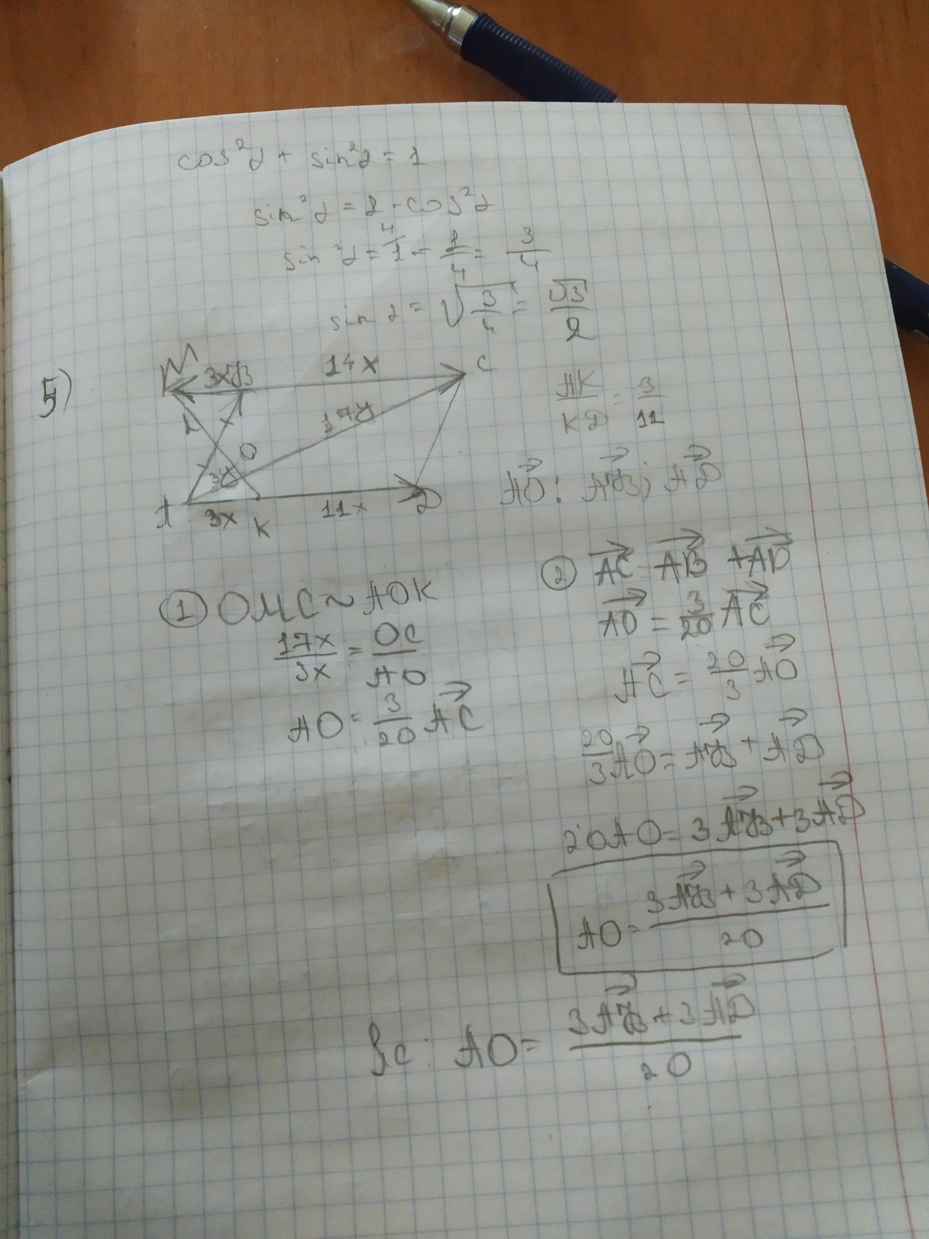 в параллелограмме ABCD на сторонах отмечены точки середина L отрезка AB и точка K на AD так,что AK:KD = 3:11. Отрезок KL пересекает диагональ AC в точке O. Выразите вектор AO через векторы AB и AD.