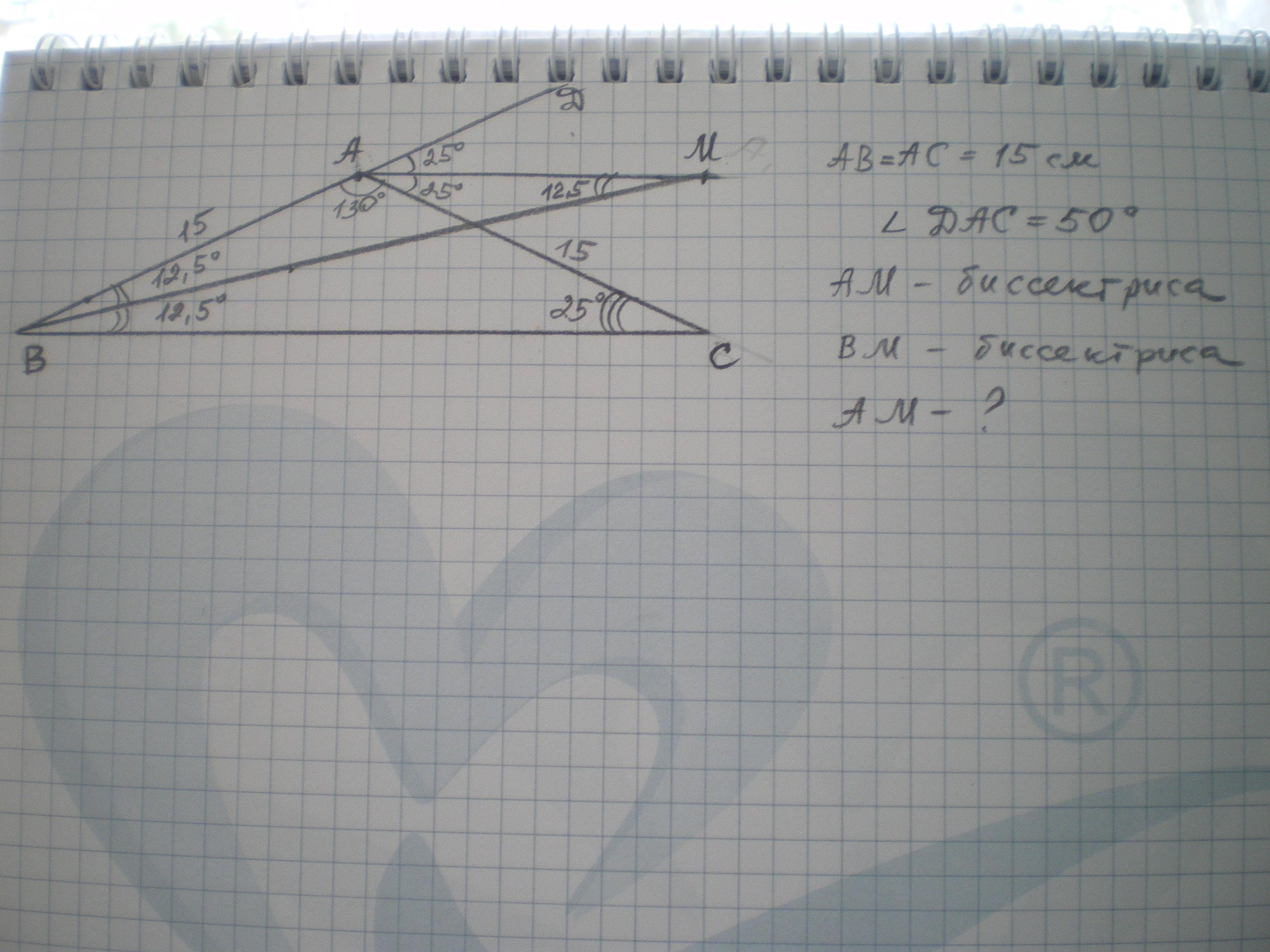 В равнобедренном треугольнике АВС внешний угол при вершине А равен 50°. Луч АА1 – биссектриса этого угла. Биссектриса угла АВС, пересекает прямую АА1, в точке М. Найдите длину отрезка АМ, если сторона АС=15 см.