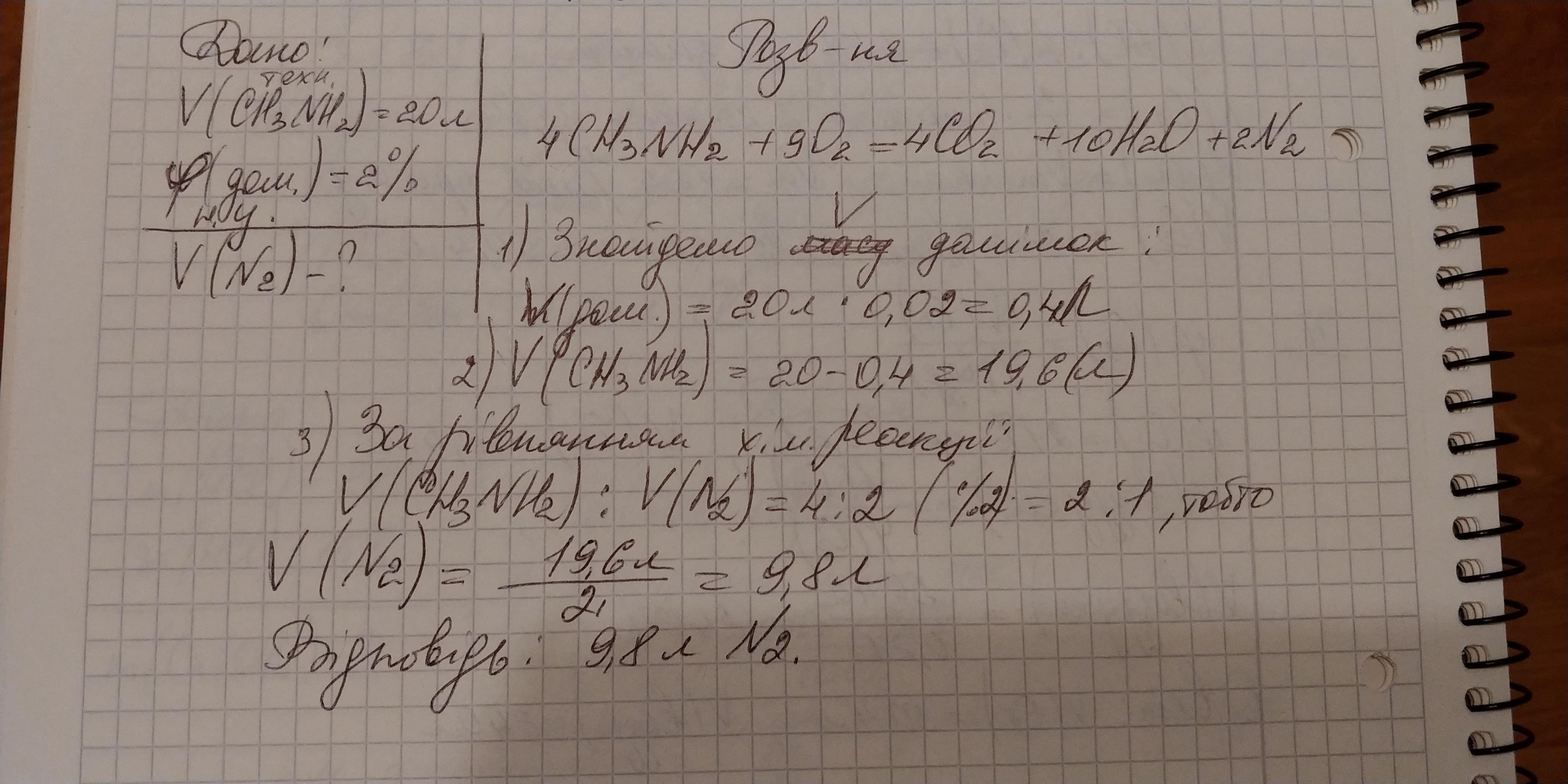 Який об*єм азоту (н.у) виділиться в результаті згоряння метиламіну об*ємом 20л, що містить 2% домішок?