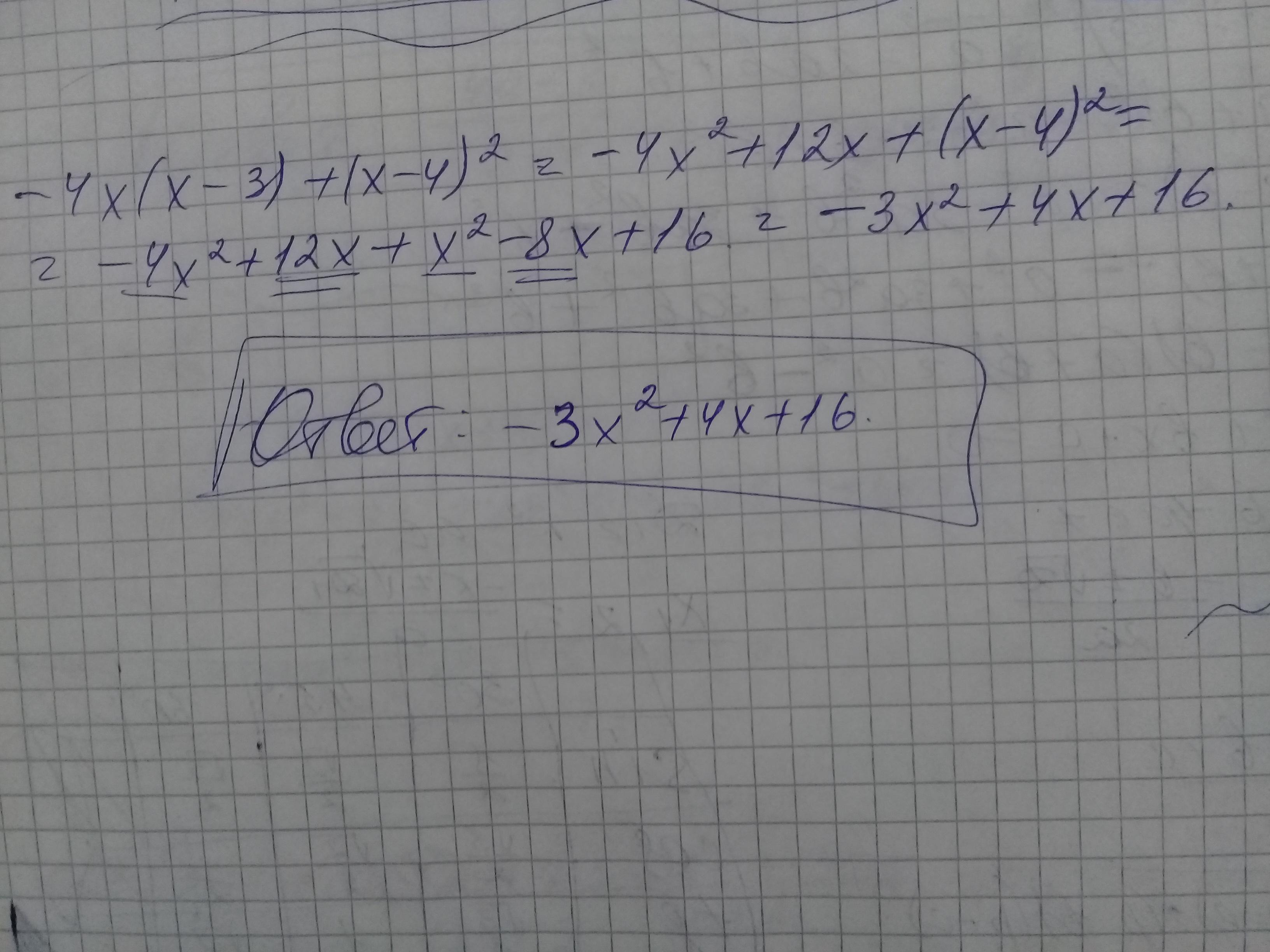 -4х(х-3)+(х-4)²=-4х² +12х+(х²-8х+16)=-4х² +12х+х² -8х+16=-3х²+4х+16