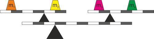 Дан многоуровневый рычаг, у которого масса противовеса m1=15кг. Каковы массы противовесов m2 , m3 и m4, если рычаг находится в состоянии равновесия?