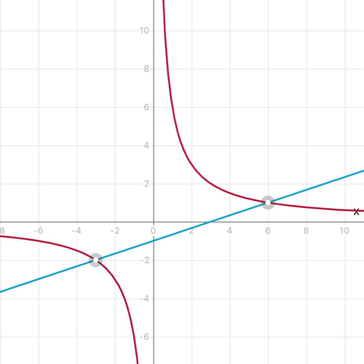Постройте на координатной плоскости график зависимостей y=6:x и y=x:3-1. найдите координаты точек пересечения этих двух графиков.