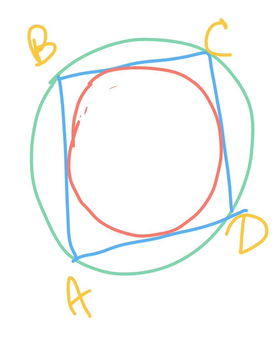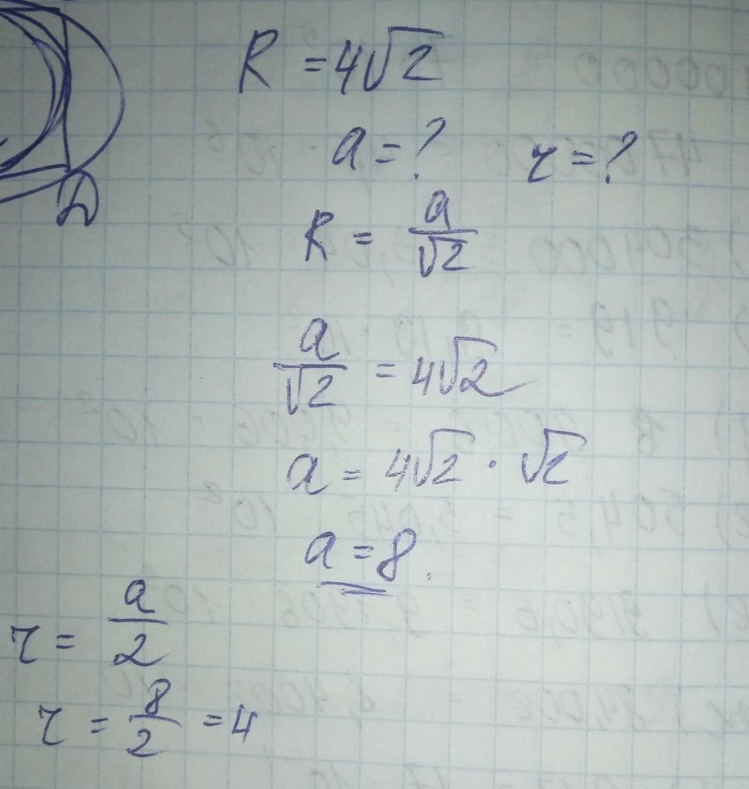 За формулами: радиус описанной окружности вокруг квадрата = а/√2
