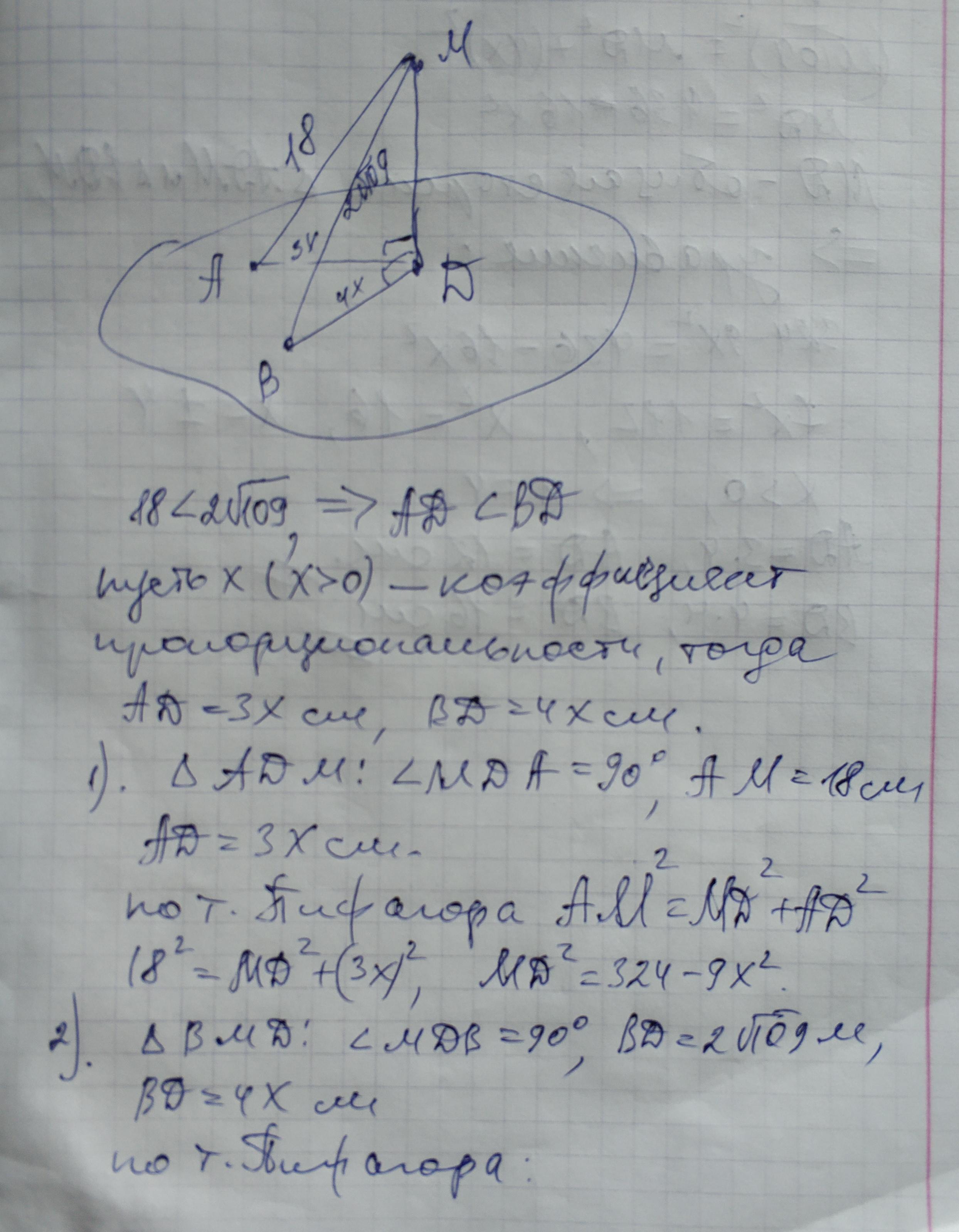 Из точки М к плоскости α проведены две наклонные, длины которых 18 и 2√109. Их проекции на эту плоскость относятся как 3:4. Найдите длины проекций. В ответе укажите меньшую длину.
