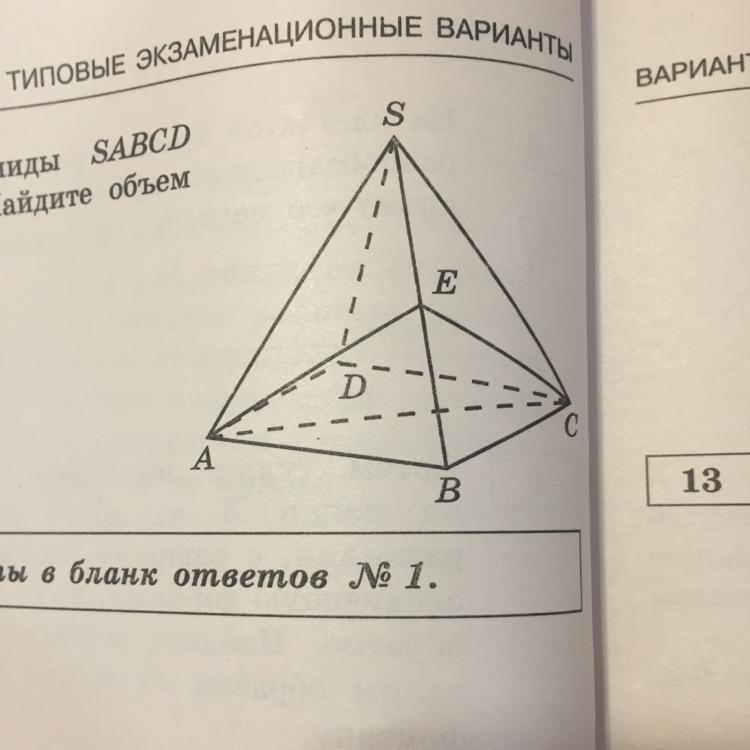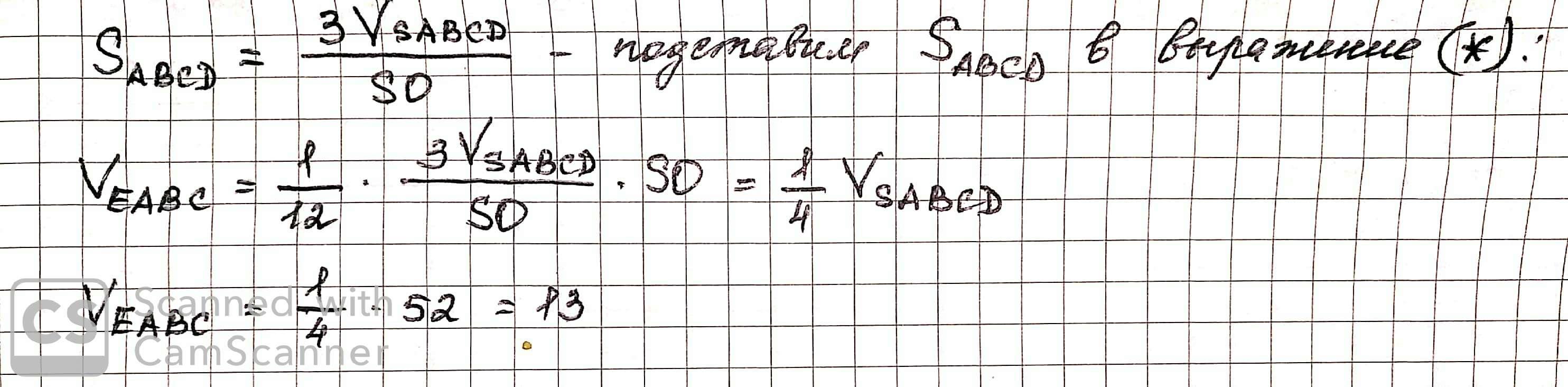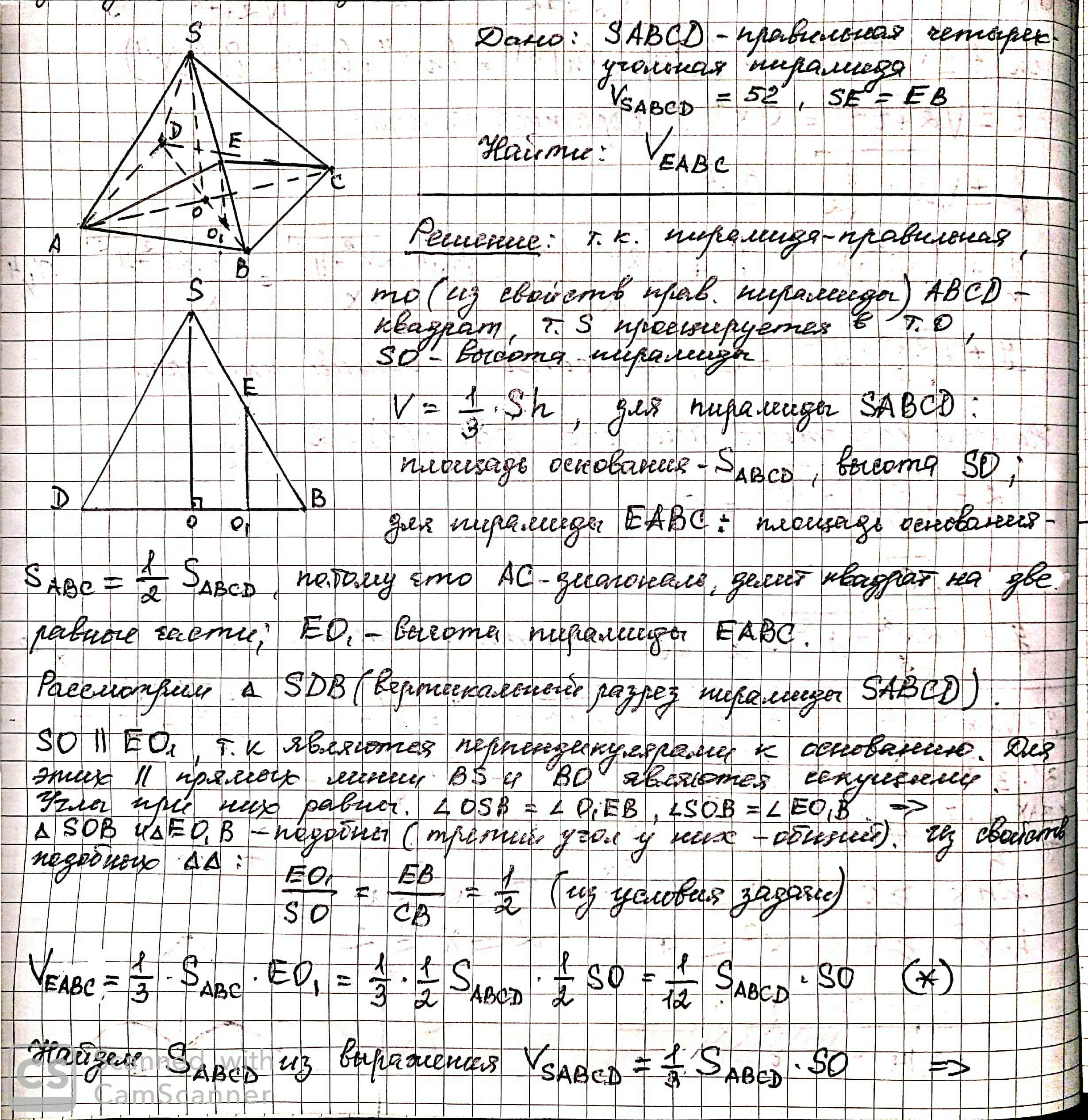 Объём правильной четырёхугольный пирамиды SABCD равен 52. Точка E-середина ребра SB. Найдите объём треугольной пирамиды EABC.