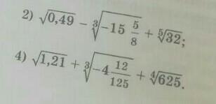 sqrt{0.49}-sqrt[3]{-15frac{5}{8}}+sqrt[5]{32}=sqrt{(0.7)^2}+sqrt[3]{frac{125}{8}}+sqrt[5]{2^5}==0.7+sqrt[3]{(frac{5}{2})^3}+2=0.7+2.5+2=5.2