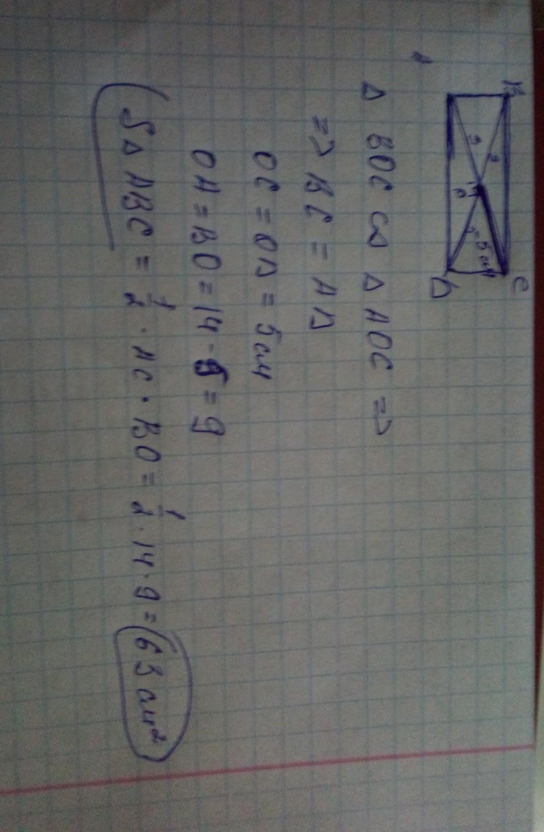 У прямокутнику ABCD AC=14 см.Вершина С віддалена від прямої ВD на 5 см.Знайдіть площу трикутника АВС.