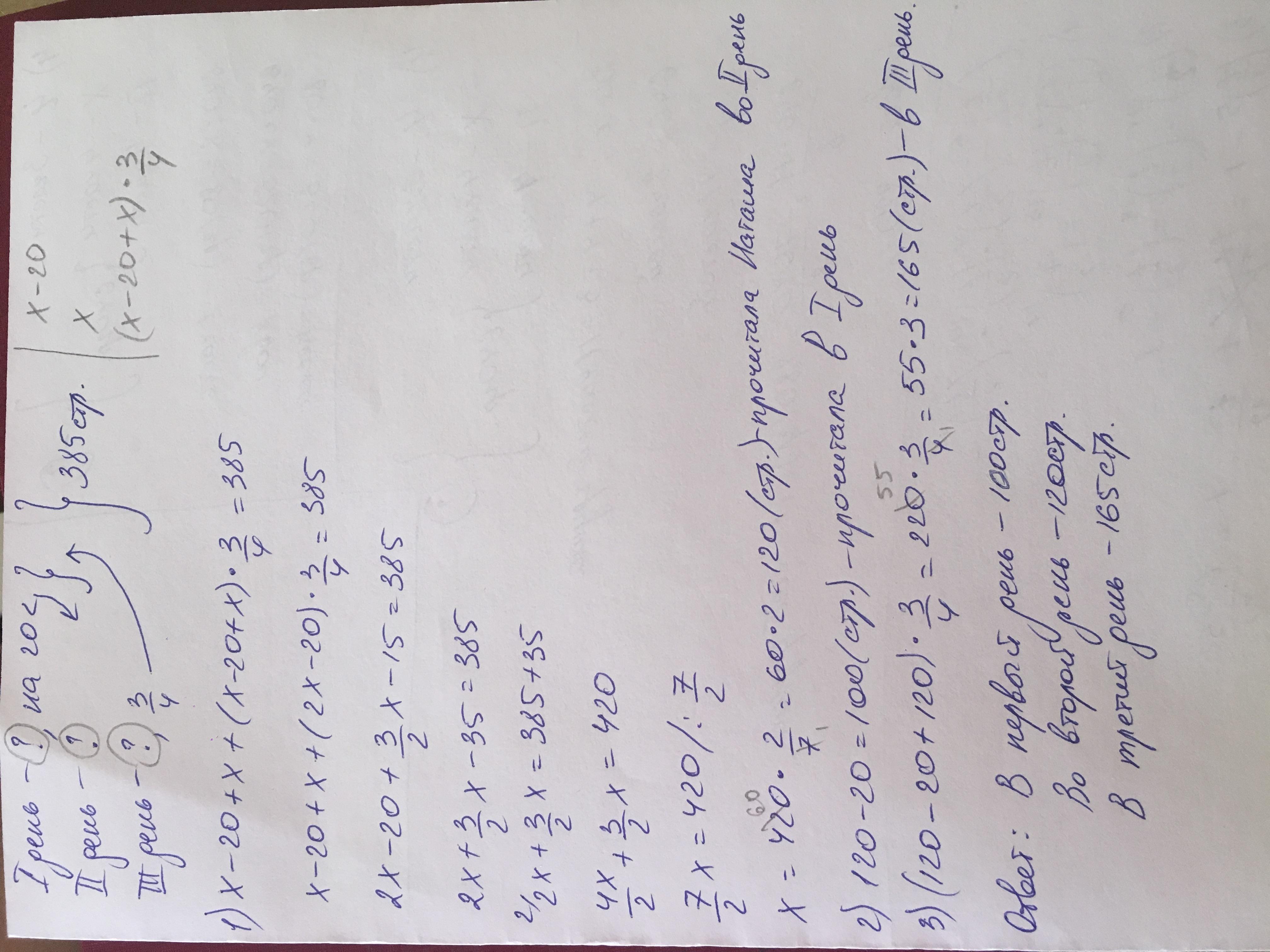 Наташа за 3 дня прочитала 385 страниц. В первый день она прочитала на 20 страниц меньше чем во 2, а в 3 3/4 того, что она прочитала в 1 и 2 день вместе. Сколько страниц Наташа прочитала в каждый из 3 дней?