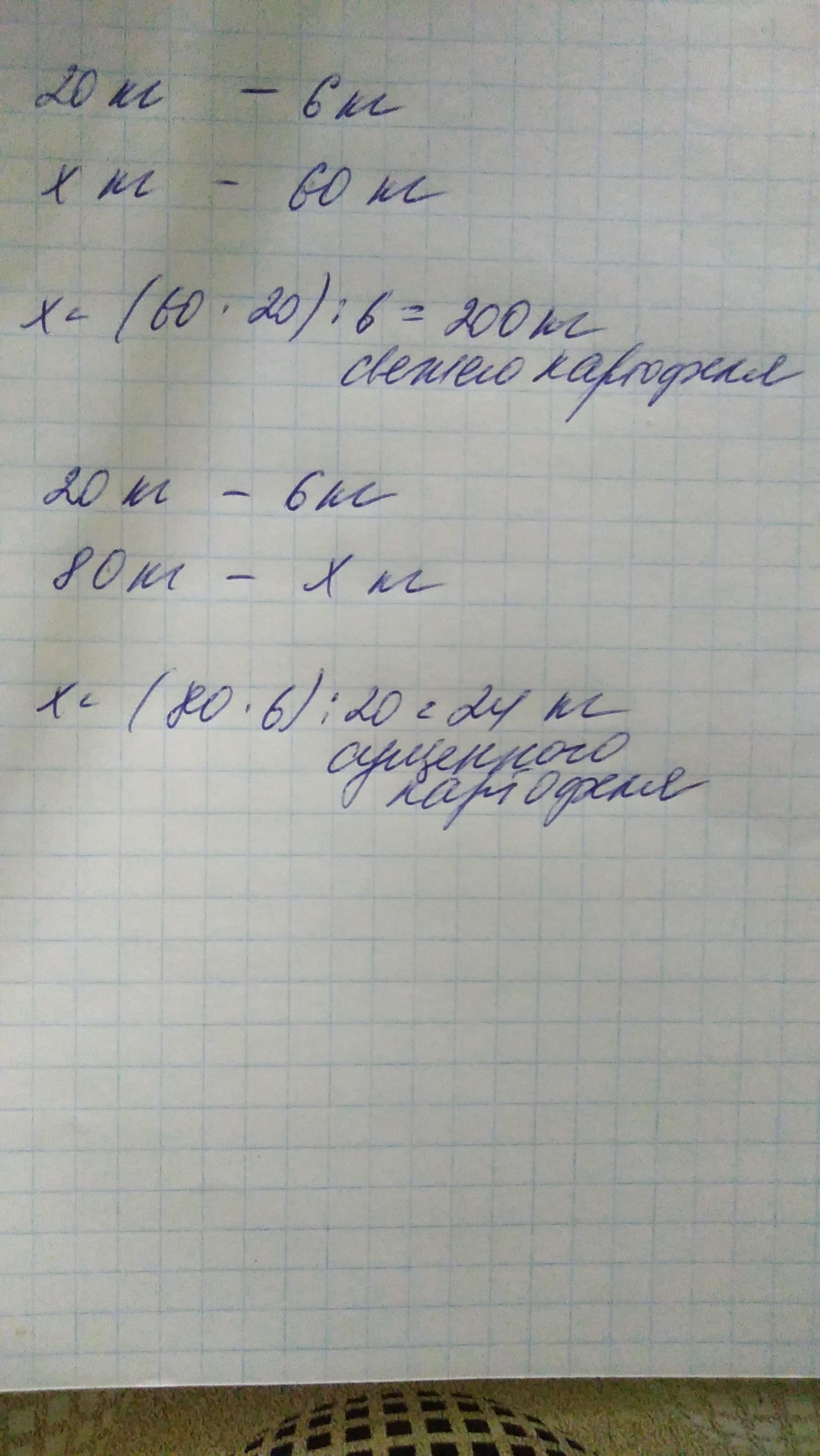 Из 20 кг свежего картофеля получается 6 кг сушёного. Сколько килограммов свежего картофеля надо переработать что бы получить60 кг сушёного ?Сколько сушёного картофеля получится из 80 кг свежего?