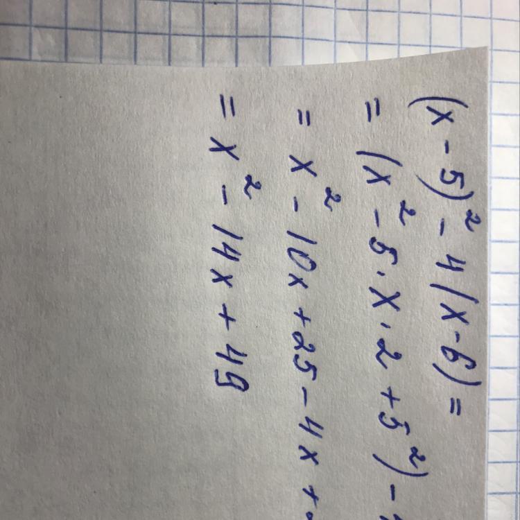 (X( во 2 степени)- 5*2*x + 5 ( во 2 степени)) - 4x + 24 = x ( во 2 степени)- 10x + 25 - 4x + 24 = x ( во 2 степени) - 14x + 49