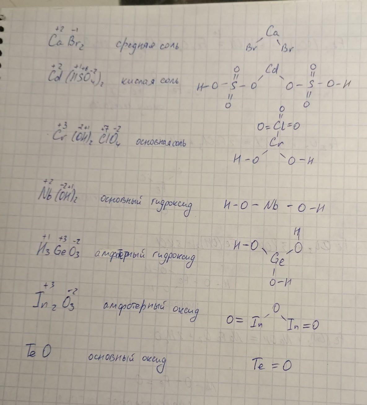 Задание 2: Бромид кальция, гидросульфат кадмия, дигидроксоперхлорат хрома(III), гидрооксид ниобия (II), германиевая кислота, оксид индия,оксид теллура (II)
