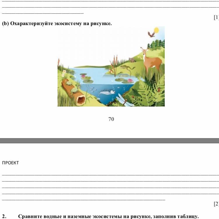 Ну что тут сказать...Обычный биогеоценоз. Как и в любом биогеоценозе, в данной экосистеме осуществляется поток энергии и замкнутый круговорот веществ, присутствует взаимосвязь всех живых организмов и абиотических факторов окружающей среды ( свет, температура). Экосистема характеризуется целостностью, устойчивостью, саморегуляцией, самовоспроизведением, и видовым многообразием (пресмыкающиеся - черепахи, рыбы, земноводные - лягушки, насекомые и млекопитающие - олень) Видно наличие всех 5 трофических уровней, продуцентов в лице растений, консументов разных порядков (животные с гетеротрофным типом питания), и редуцентов, которые нет на рисунке, но тем не менее они присутствуют в почве, это бактерии. Также биогеоценоз характеризуется вертикальной пространственной структурой - ярусностью и горизонтальной пространственной структурой - мозаичностью.